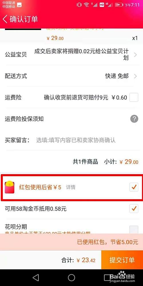在支付前勾选“红包使用后省5元”即可,交易完成后即会提醒你已使用该红包。