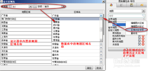 注:如果数据库中的区域名称跟设计器中内置的地图区域名称对应不上,在使用过程中就会使用默认的区域对应关系,则无法获取到数据库中区域的对应数据。