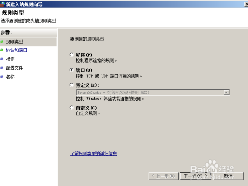 选择入站规则穿件类型“自定义”。自定义模式可以控制访问源IP地址。