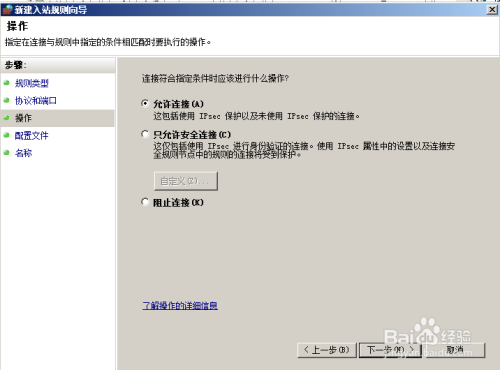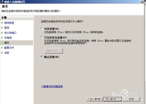 选择防火墙针对该通信的处理方式允许连接。阻止连接,将拒绝外部连接到本地计算机的TCP 445,只允许安全连接,是与IPSER结合实现加密通讯。