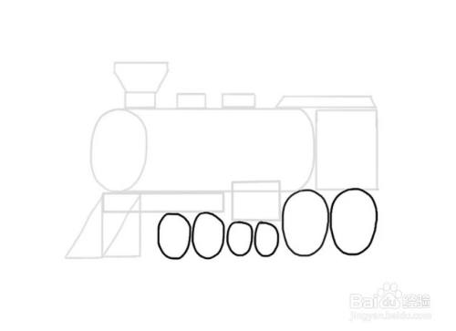 然后在车身上画大小不同的六个椭圆形作为火车轮子,靠后的两个椭圆形画最大。