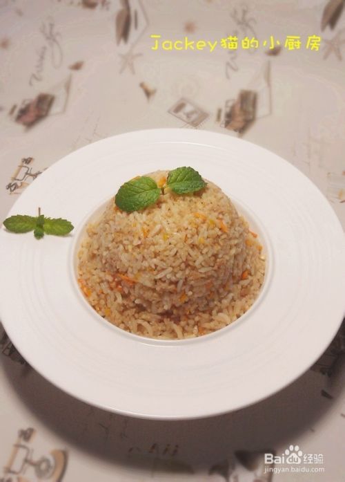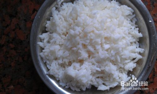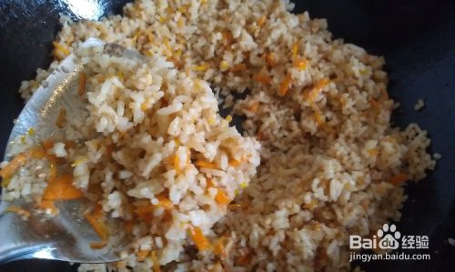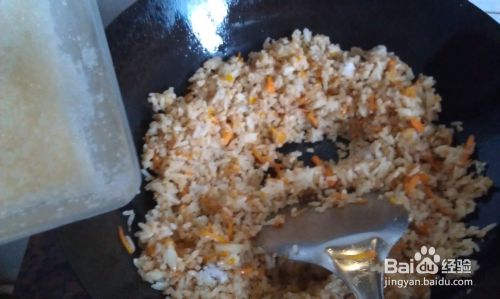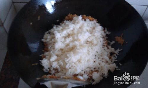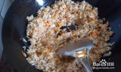 不停地翻炒,直至米饭呈现一粒粒地状态。