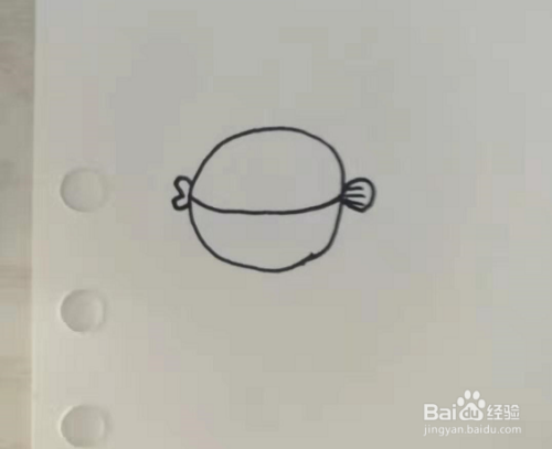 第四步,这里我们要画出刺豚的眼睛,在圆的上半部分,画上一个小圆,圆里面画上一个小黑点,然后在中间线的下方,画上鱼鳍,如下图所示。
