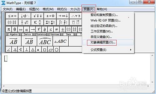 在MathType窗口中,在菜单中选择“预置”——“编辑对象预置”。