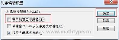 点击“编辑对象预置”后会弹出一个对话框,将“在单独窗口编辑”前面的勾去掉,然后确定后关闭MathType软件。
