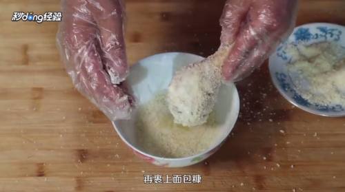 5将鸡腿裹上生粉,再裹上鸡蛋液,再裹上面包糠。