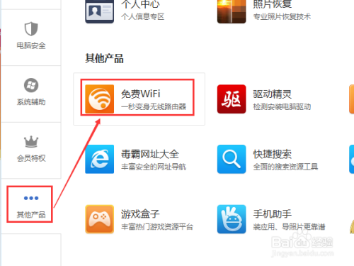 点击免费WIFI。进入其他产品界面之后,有一个免费WIFI功能,点击就可以开启无线网络功能。设置无线网络名称和密码。