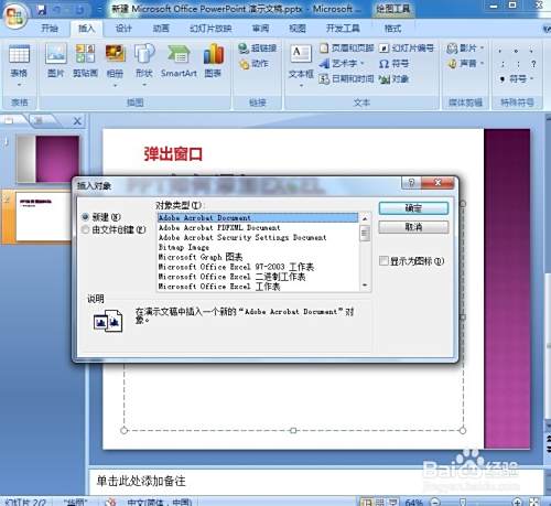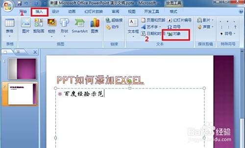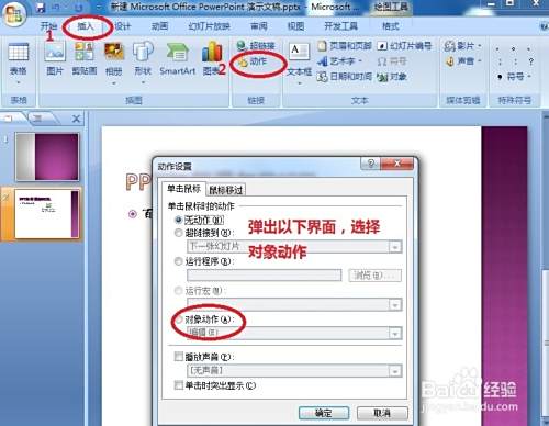 第一步:打开PPT,翻页至想要插入的页面。选择插入选项卡,在插入的子选项卡中选择对象选项。