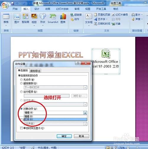 如何在PPT中插入 Excel,并在演讲时单击即打开Excel的设置方法。