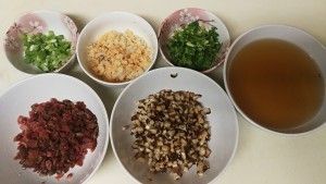将所有食材全部切丁备用,泡香菇和虾干的水混合保留。