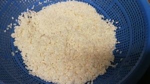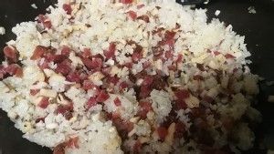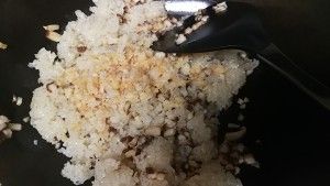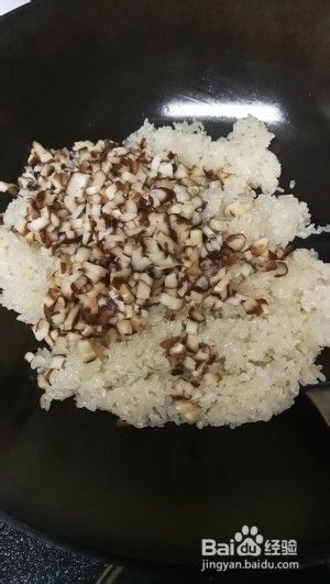不粘锅加热,加油后入糯米翻炒。翻炒到糯米中水份收干,开始洒2勺香菇水,盖锅盖焖一分钟。开盖翻炒再加2勺香菇水,再盖上焖一分钟,如此循环,直到糯米完全炒熟。