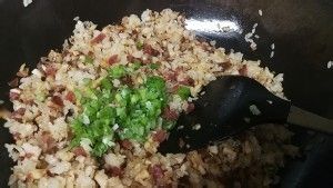加入香肠腊肉粒翻炒后,再加入1勺生抽半勺老抽半勺蚝油,翻炒均匀。