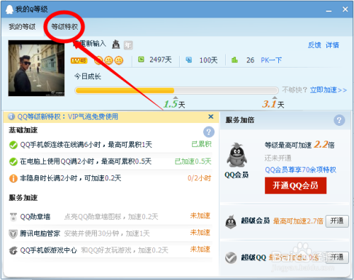 QQ“活跃天”设置为超过2小时为一活跃天。使用“活跃天”而非“小时”的概念, 更能公平体现出用户在QQ上的活跃度。“活跃天”指的是如果用户当天使用QQ超过一定的时间,我们就认为用户这一天是活跃的,会为其活跃天数加上一天。然而升级QQ又有什么特权呢?让我们一起来看一下。