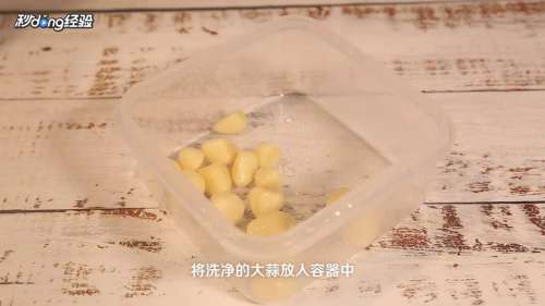 洗净后捞出,控干水分,将洗净的大蒜放入容器中。