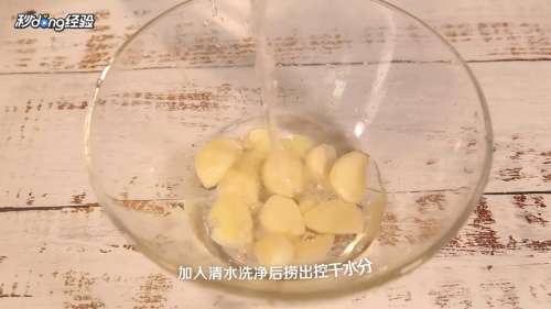 将大蒜剥去外皮,放入碗中,加入清水。