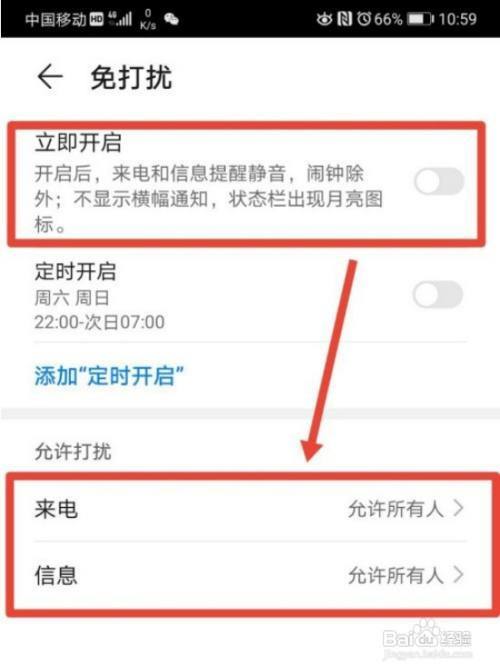 进入到免打扰功能设置页面后,可以看到允许打扰功能项中可以设置允许来电、信息人员;