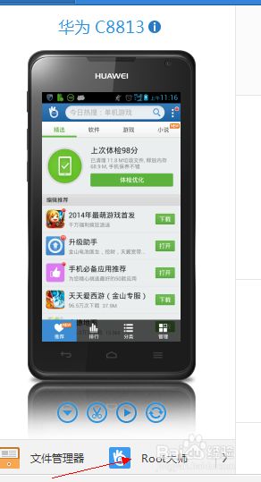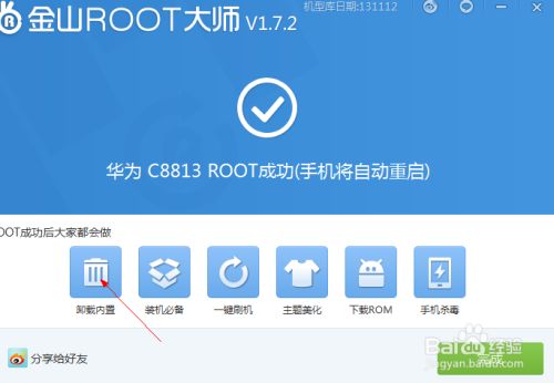 首先呢,将你的手机连接到电脑上面,通过金山手机助手的一键root功能。先进行root。成功后,如下图所示。