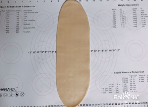 面团分割好后,直接取一个面团来擀卷,其他两个面团用保鲜膜盖住,以免表皮风干。收口朝下,光滑处面对我们,用擀面杖擀成40厘米长,将面团翻过来,将面团稍微拉长一下,这样卷的圈数会多点。——如果想让成品侧面的圆圈发的好看,面团擀的时候,上下宽度要一致。——如果是夏天,为了防止面团过快发酵,其他2个没操作的面团就盖上保鲜膜,放入冰箱冷冻,等要揉了再拿出来,而揉好的面团,也是放入冷冻室。全部整形完,再拿出来进来发酵。这个方法还有个好处就是,对于面团温度超过28度的,可以急速降温,这样可以预防组织粗糙了。记得是放冷冻,不是冷藏那一层。