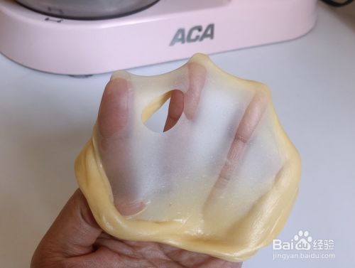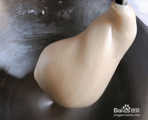 奶油加到粘底就不要加了,等到不粘底,再看面团状态来看是否再加,千万不能加到粘手。——如果面团偶尔会分成两段,属于正常,如果频繁断开,那可以再继续加点奶油。