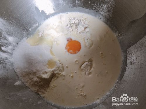 除了黄油和酵母,其他所有材料混合。——考虑到面粉吸水量问题,如果你奶油用量是六七十克的,奶油就先放一半,后面再放。记住,预留的是淡奶油。如果一次性放完,因为把控不好,可能面团会比较粘或者揉出来特别软,所以建议先预留一半。——老手或冬天可以除了黄油外,其他材料全部混合。