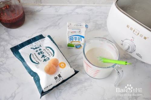 先将糯米粉、玉米淀粉、牛奶放在容器中,充分搅拌均匀。