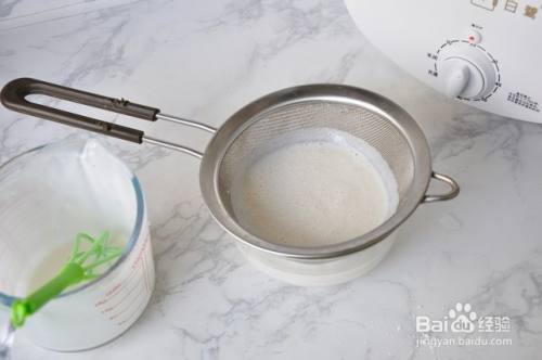 用网筛对调好的面糊进行过筛,建议过筛两次,如果有没有搅拌均匀的,可以借助勺子压一下。