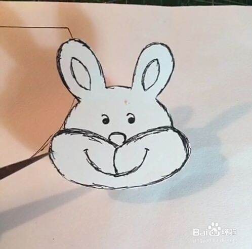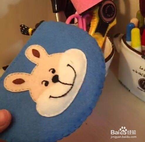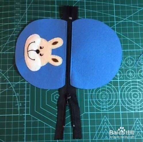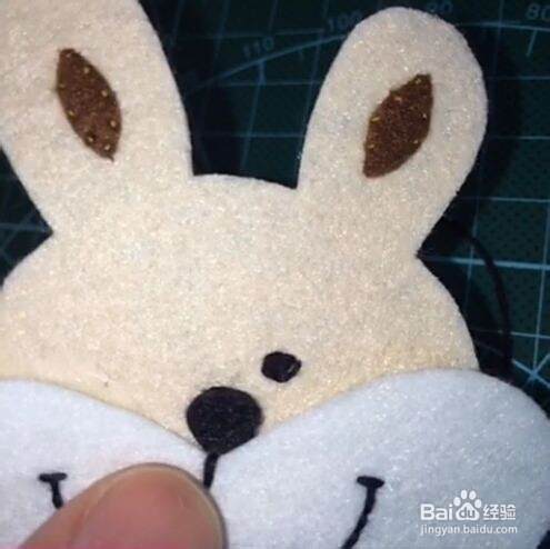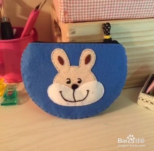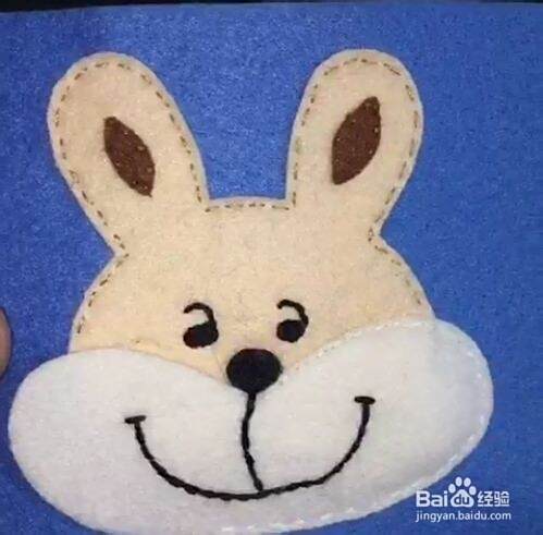 将兔子耳朵,头,胡子用黑色线缝好,再缝缝到蓝色不织布钱包上。