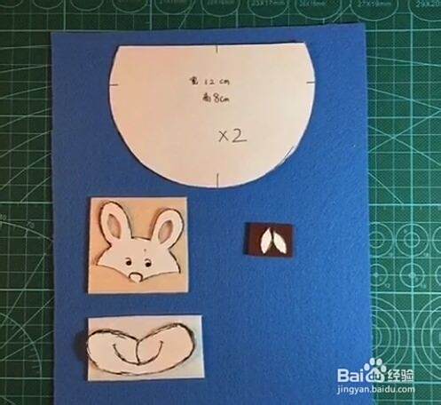 画好后,纸板图案剪出来,然后将不织布放在下边照着边缘剪好,兔子部分只要剪一个,而钱包各剪两半才能对合(我的钱包选用蓝色不织布,兔子头选用肉色不织布,兔子胡子选用白色不织布,兔子耳朵选用咖啡色不织布