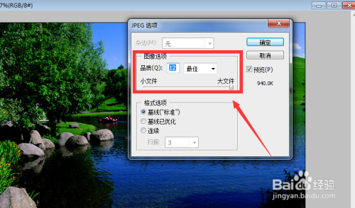 出现选框,选择 图像选项中的 品质项,把数值改为合适的数值,点击确定。
