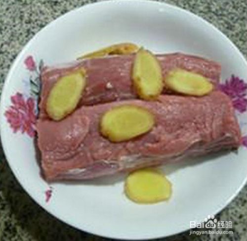 将里脊肉放入大盘中,搁入姜片