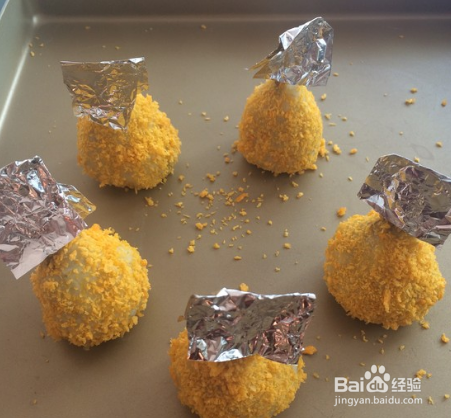 裹上面包糠,虾尾部分覆盖锡纸,烤箱提前预热,上下火200度15分钟(具体温度视自家烤箱情况而定)