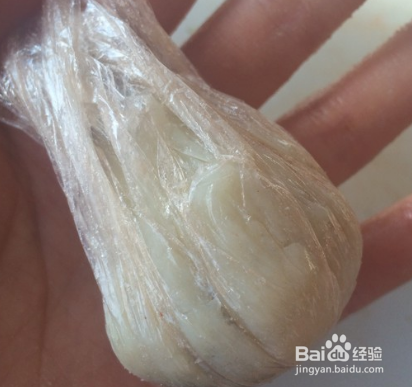 用一小块保鲜膜,取适量土豆泥,包裹上虾仁,露出虾尾部分。