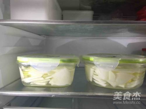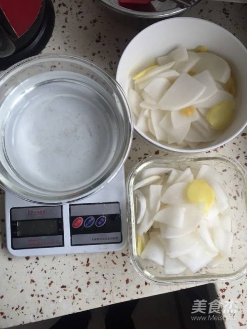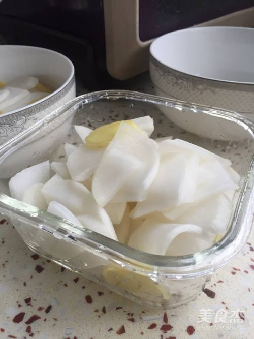 2白萝卜切成中等厚片,生姜切薄片,放入适量盐腌制,去除萝卜中的水份。等待20-30分钟,久一点也没关系,然后倒掉析出的水份。图中是腌制好,倒掉沥出水份的萝卜。