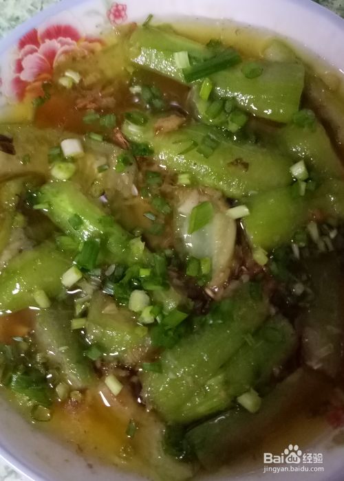 等锅里水快收干的时候,翻炒一下,加味精调味,就可以出锅了,然后撒上葱花。清香的猪油炒丝瓜就过成了。