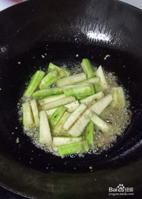 姜和大蒜的香味出来了,就倒入丝瓜条块,加盐翻炒,在加一饭碗清水,把丝瓜焖煮一下。