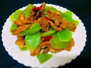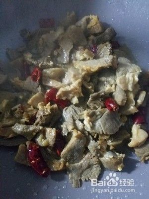 姜红辣椒切碎备用,锅中加油烧热倒入生姜辣椒爆香,倒入肉片翻炒2分钟