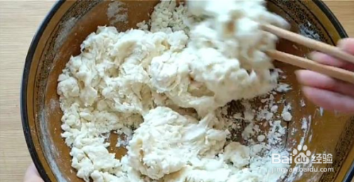先来制作油皮。300克面粉、3克盐、30毫升食用油一起放入盆中。用180毫升温水和面,边倒边搅拌,先搅拌成絮状。食用油建议使用熟油,也就是加热过的油,这样做出来的椒盐饼吃起来就没有生油味。