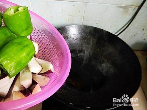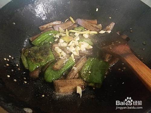 将辣椒与茄子一起倒入锅内