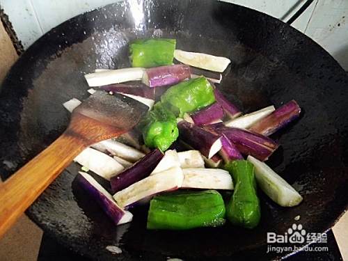 煸炒茄子与辣椒,滴入料酒生抽适量,焖煮2分钟