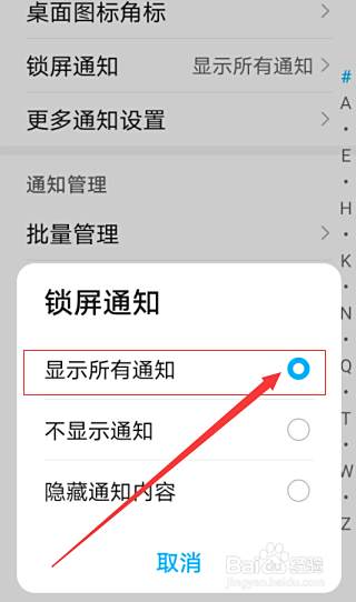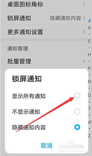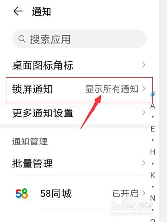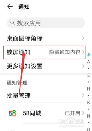 进入通知页面,然后点击【锁屏通知】现在锁屏通知是隐藏通知内容状态。