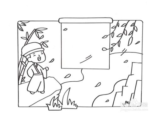 接着在外围画上边框,人物脚下画上一块石头,身后画上竹子,右侧画上山和柳枝。