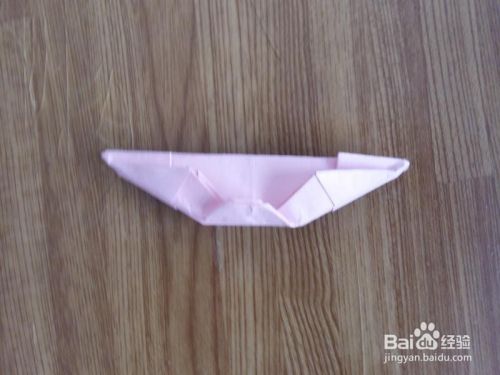 上图最后俯视图如下。从其中一头开始,左右手拇指、食指分别捏住折纸外部折线处,拇指向两侧外翻、食指往怀里顶,待翻转成型后,用手指轻轻挑起两头的船棚,大功告成!