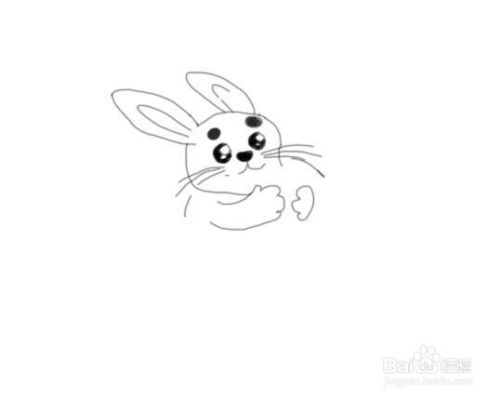 再在兔子的眼睛下面再画出兔子的鼻子和嘴巴,然后再在嘴巴的两侧再画出兔子的胡须,如图所示: