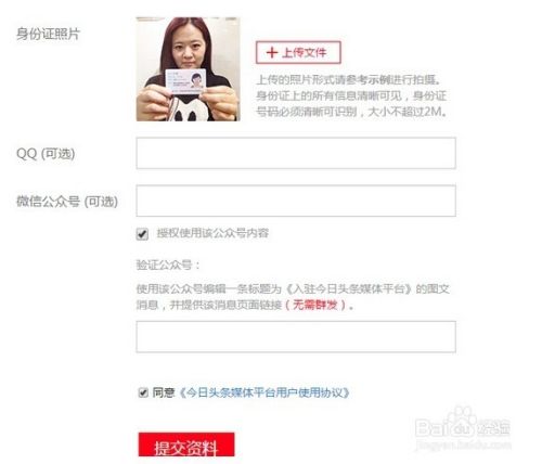 下一步就是填写你的个人相关资料了,在这里主要注意的有两点:第一就是辅助材料栏目的内容,里面是这样的提示的:“10~100个字符 请提供您本人的专栏、博客或微信公众号等信息,我们会以您提供的文章做为参考依据,审核您申请的帐号。”所以说如果你自己有博客,或者在行业垂直网站上有开设个人专栏的话,那我相信审核是很容易通过的。在网上也经常听到一些同学说申请今日头条我的怎么就不通过审核呢?那很可能就是因为你没有什么个人品牌度,也没专栏博客什么的,在网上也比较少见到你的文章,所以今日头条的小编们才将你拒之门外。第二点就是手持身份证那照片,要求能看清你的身份证号码的,这个需要注意一下。我觉得平常多写点东西是挺好的事情,做互联网的基本功就是写了。