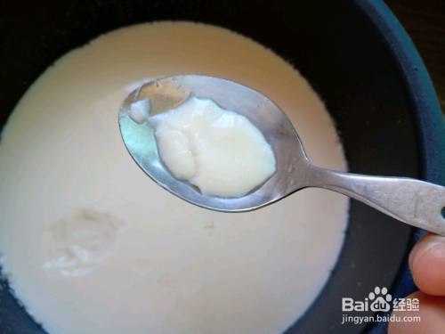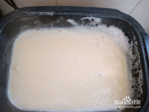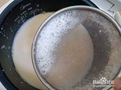 豆浆刚煮开很烫,等温度在80度以内时倒入电饭锅里,再把内脂水也倒进去搅拌几下,有气泡就要舀出来,马上盖上盖子保温