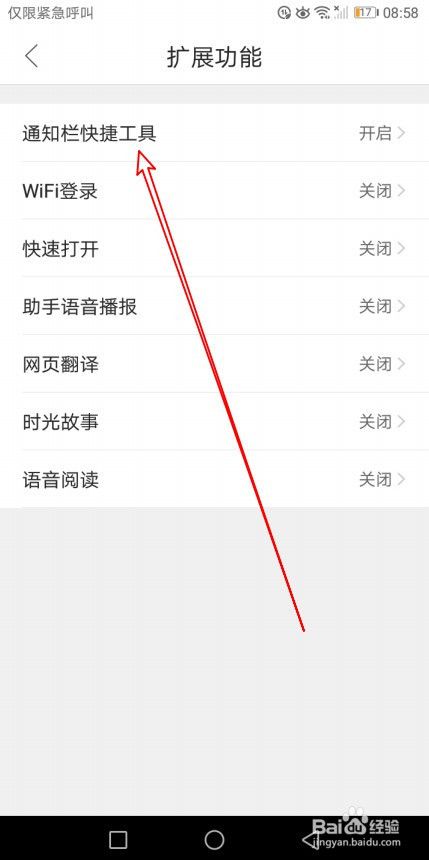 然后在打开的扩展功能页面中,点击通知栏快捷工具的设置项