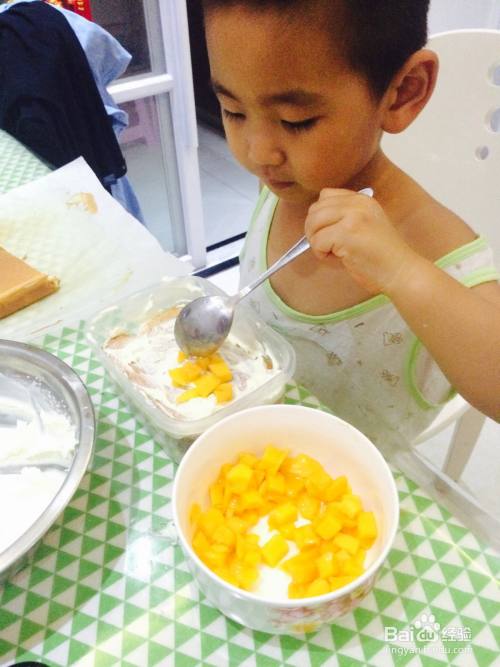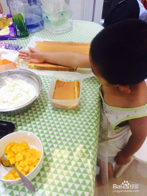 1.蛋糕饼取出晾凉,找好盒子,对应盒子切块. 2.芒果去皮切小块。 3.淡奶油加入剩余细砂糖打发(安佳奶油需冷藏7度才易打发,打发后快速使用,否则夏天温度高易融化)
