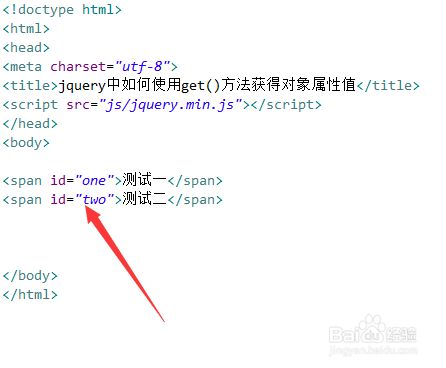 2、在js中,通过元素名称获得span对象,使用get(1)获得第二个span对象,并使用alert()方法输出对象的id属性值。