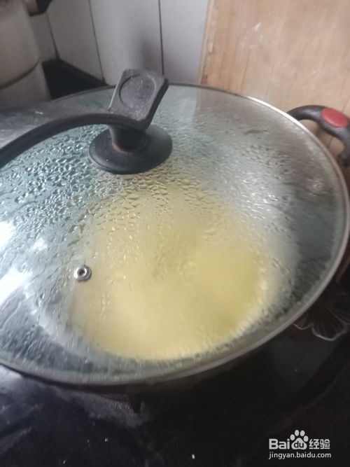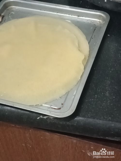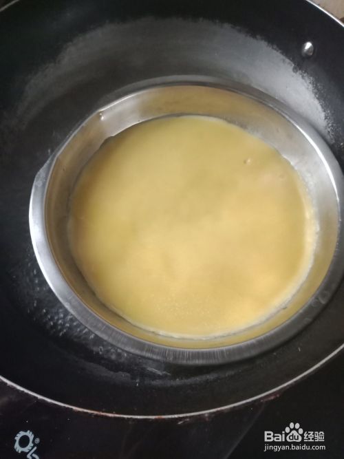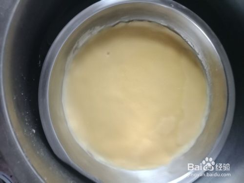 接着用小勺盛一小勺倒入一个平底盘中,覆盖均匀,放入开水中。