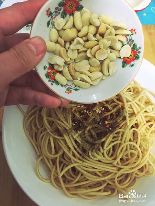 加入烤花生米。其实砸碎一点会更香很好吃。